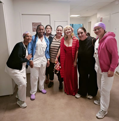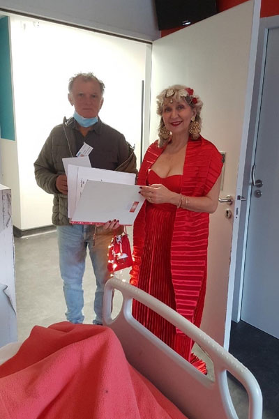 Lundi 15 décembre 2025. Montpellier (34), clinique Clementville, Nathalie chante Noël pour tous les patients dans les chambres, accompagnée de Nadine, présidente de l’association JALMALV.